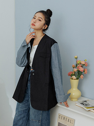 ▲限時搶購880▼幾何剪裁牛仔拼接條紋袖外套