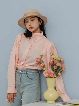 純色排釦領澎澎袖襯衫