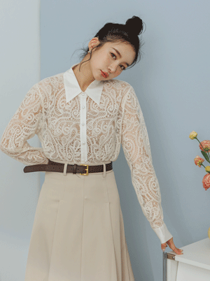 透肌感重工蕾絲珍珠釦襯衫