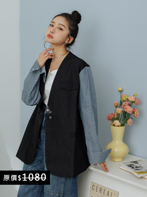 ▲限時搶購880▼幾何剪裁牛仔拼接條紋袖外套