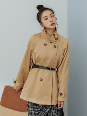 雙排扣立領皮帶寬袖風衣外套