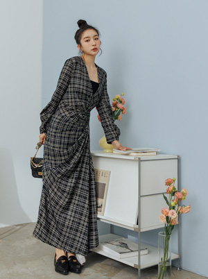 格紋V領抓褶不規則裙襬長洋