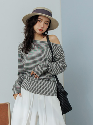 條紋斜肩抓褶收腰天絲上衣 TOMO購物清單