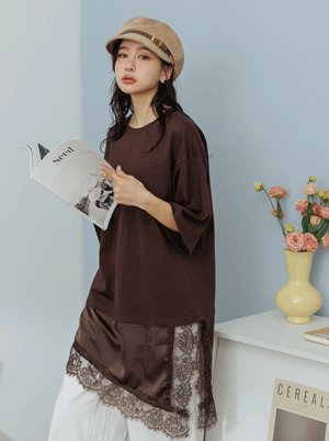 拼接緞面蕾絲長版寬大T