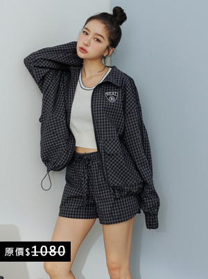 ▲限時搶購880▼刺繡布標格紋外套+滾邊短褲