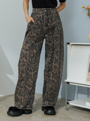 渲染豹紋拼接牛仔長褲